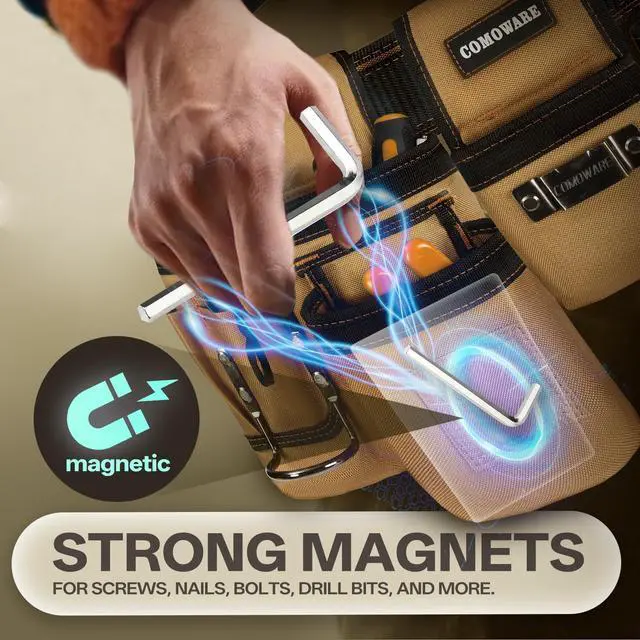 [Magnetic Zone for Small Tools] A dedicated magnetic strip securely holds nails, screws, and metal accessories, keeping essentials within reach without cluttering your pockets. Paired with two hammer loops and a tape measure clip, this tool belt streamlines workflows for electricians and carpenters.