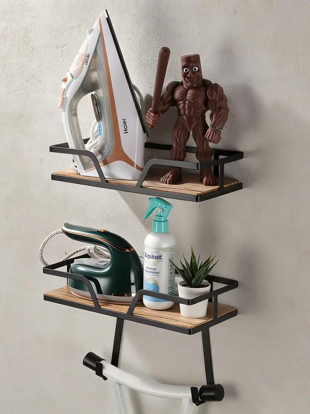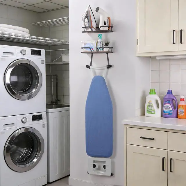 This wall-mounted iron organizer is an essential storage solution for any laundry area.