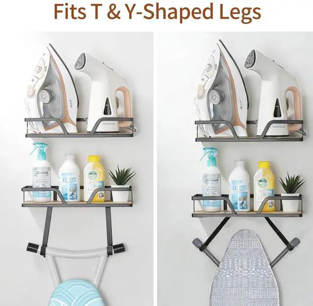 Two hooks under one basket securely hold your ironing board, fitting both T-leg and Y-leg styles.