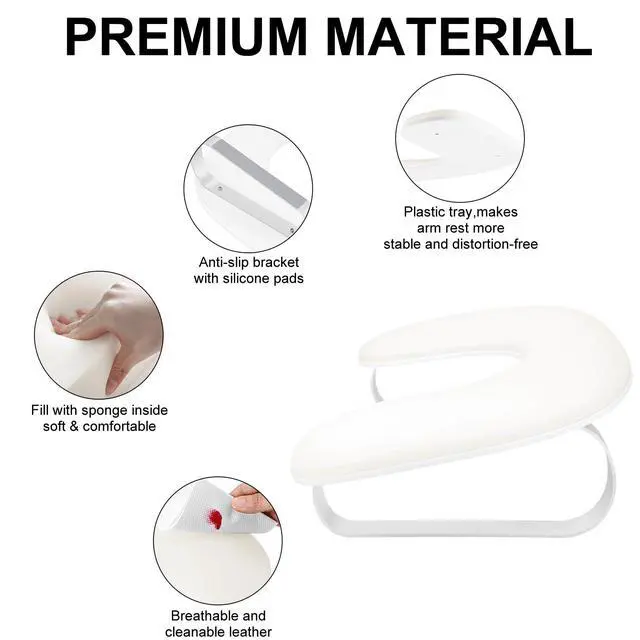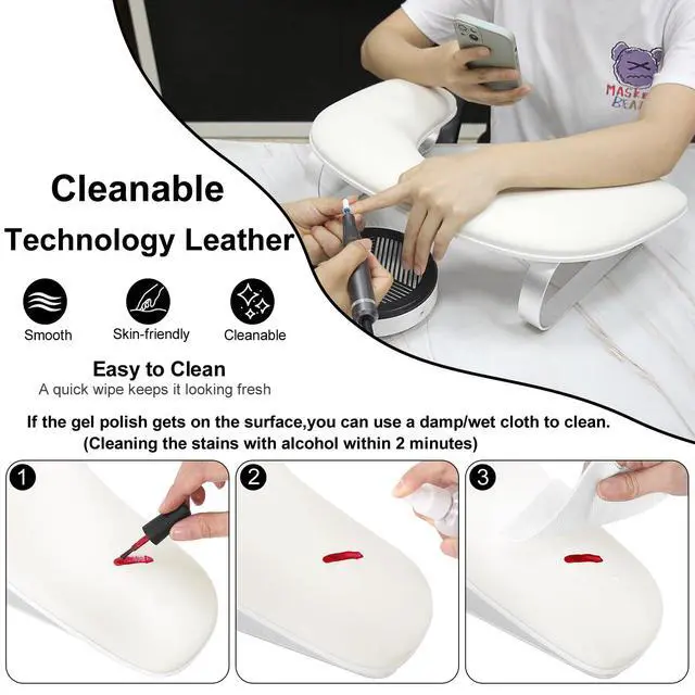 Cleanable & Comfortable:Our nail arm rest are made of cleanable technological leather and non-deformable resilient sponge,effectively relieve your hand fatigue.The PU leather surface is stylish and easy to maintain.A quick wipe keeps it looking fresh. (NOTE:It is easily wiped clean with a damp cloth within 2 mins.Acidic or caustic cleaning solutions are prohibited)