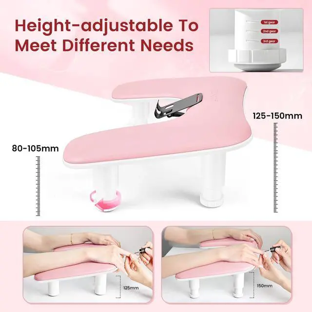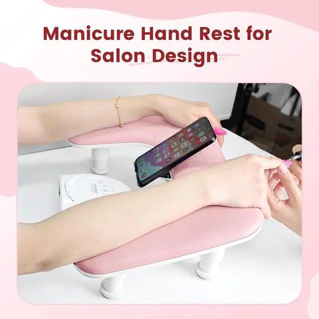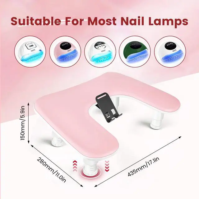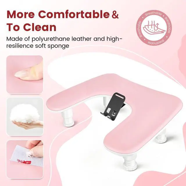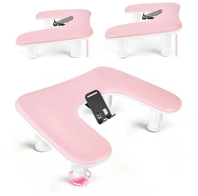 You will receive: A U-shaped pink manicure hand rest with a built-in mobile phone holder and adjustable manicure arm support. The height of the manicure hand rest can be adjusted to three different levels to meet the needs of each customer. The pillow core is made of comfortable PU material, which is durable and easy to clean.