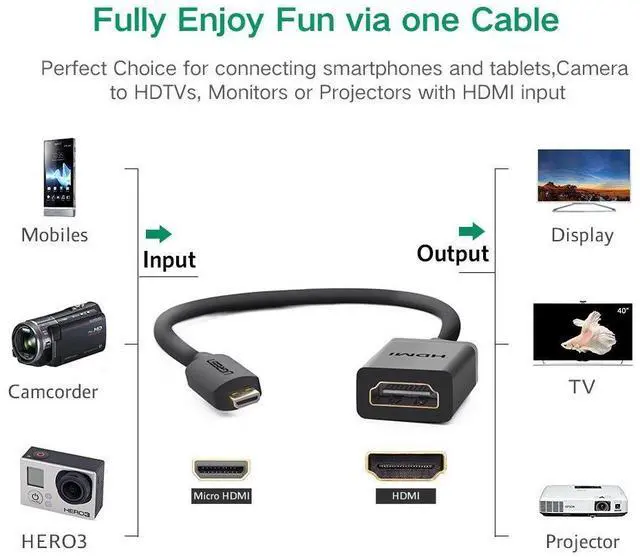 Micro HDMI to HDMI cable delivers both high-definition video and digital audio from digital devices to your home theater.It offers an ideal way to connect digital devices with Micro HDMI (HDMI D) ports to HDTVs or Projectors with full-size HDMI (HDMI A) ports. Please note that micro HDMI ports are different than mini HDMI - check your device's port