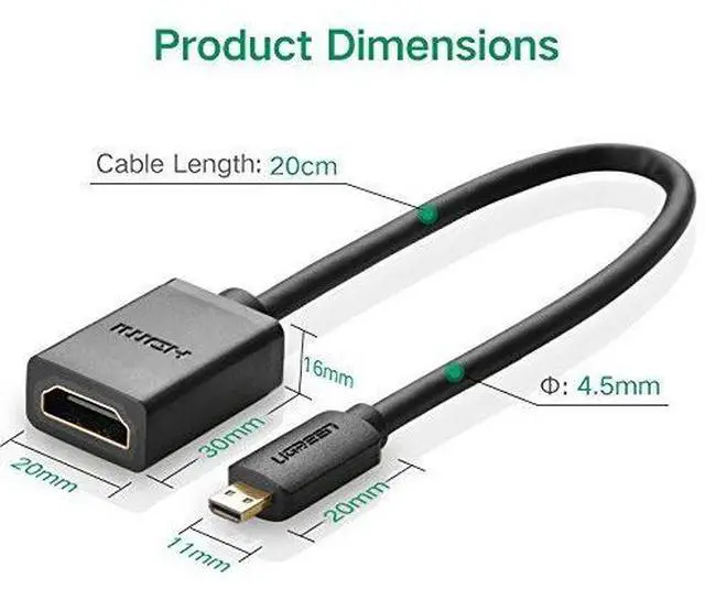 UGREEN Micro HDMI to HDMI Extension Cable with Ethernet Type D to Type A Support 3D & 4K Resolution for Smart Phones, Tablets, Cameras and Other Device Gold Plated 20cm, Black