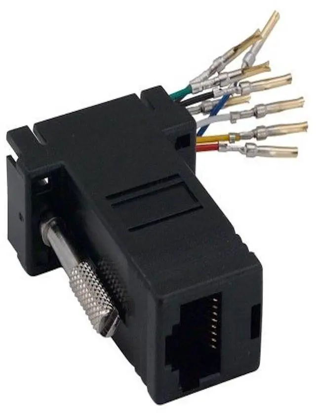Extend your serial connections with this SANOXY modular adapter. It easily converts a DB9 female connector to an RJ-45 jack, allowing you to connect PCs, dump terminals, telecom equipment, and other serial devices over long distances using inexpensive twisted pair wire. This adapter features easy assembly with slotted thumbscrews for a secure connectio