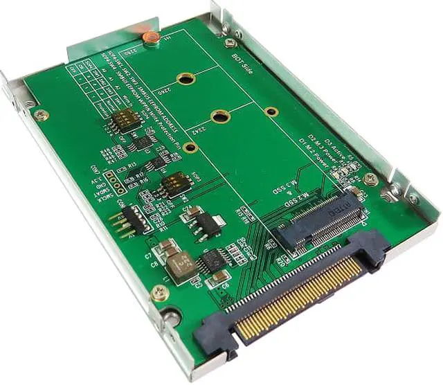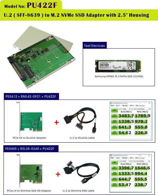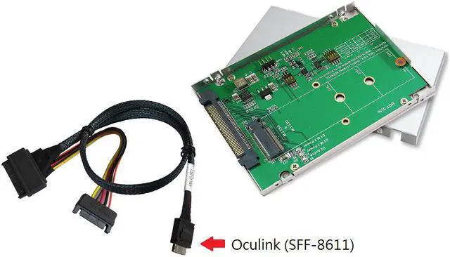3 Dual ports, U. 2 Dual ports D1 Green LED on indicates M. 2 NVMe SSD power ready D2 Green LED on indicates M. 2 NVMe SSD power ready D3 RED LED Blinking indicates M. 2 & M. 3 SSD active status U. 2 (SFF-8639) to Oculink (SFF-8611) Cable -- 50CM