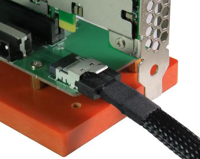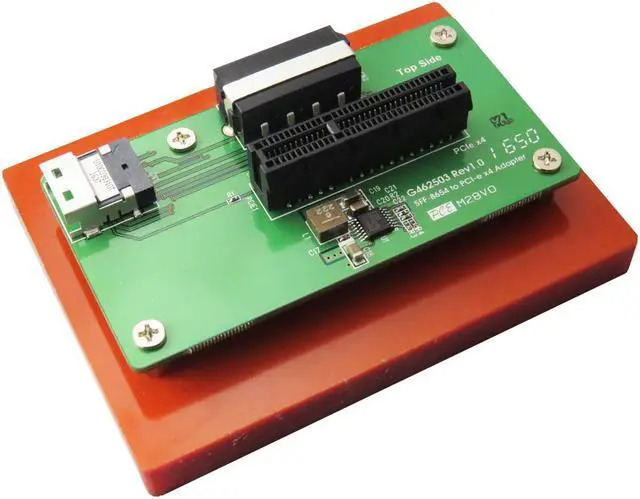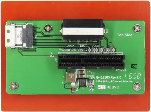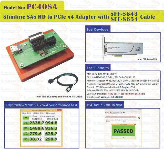 PC408A Specification: PCIe x4 to Slimline SAS(SFF-8654) convert Build in PCIe x4 open-ended connector Build in SFF-8654 connector, pin-out defined by PCIe PWM synchronous buck converter Power IC 3.3V, 4A maximum output current Short circuit protection In-rush current suppression Thermal shutdown protection ESD HBM (Human Body Mode) /2KV