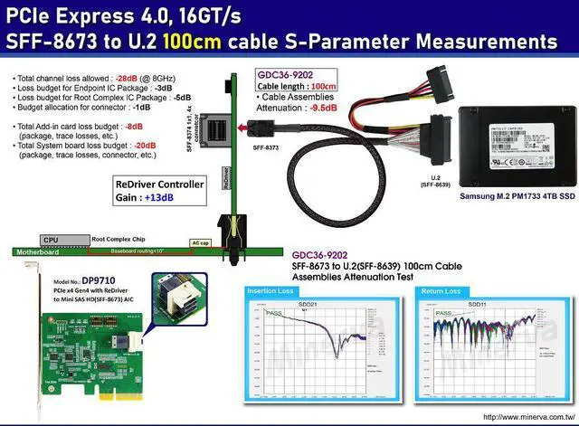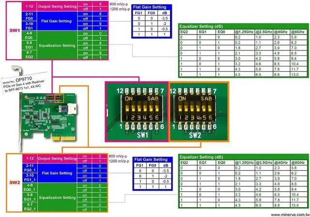 * Built-in ReDriver to extend PCIe 4.0, 16GT/s 16 lanes differential pair signals data link width, and may provides programmable linear equalization, output swing and flat gain