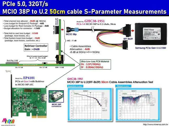 * Built-in ReDriver to extend PCIe 5.0, 32GT/s 4 lanes differential pair signals data link width, and may provides equalization up to 24 dB at 16 GHz