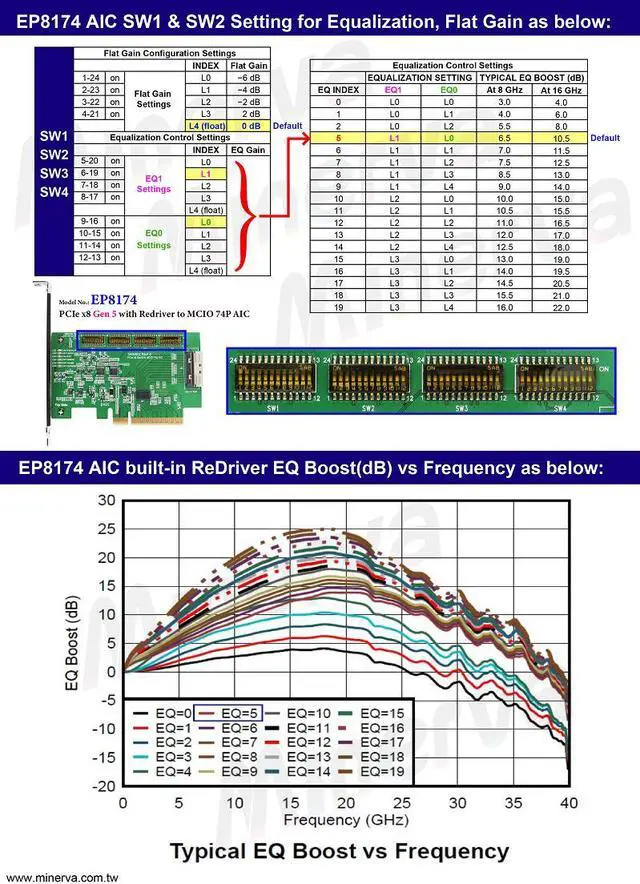 * Built-in ReDriver controller to extend PCIe 5.0, 32GT/s 8 lanes signals and may provides programmable linear equalization, flat gain.