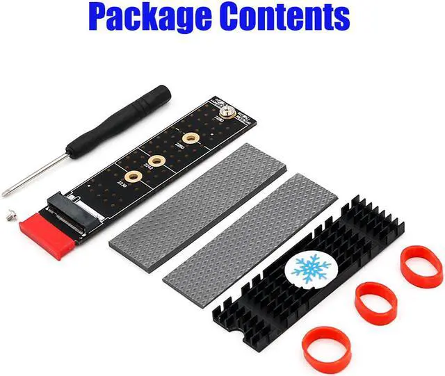 SSD Package contents: •1x M. 2 SSD to PCI- E 1X adapter • 1x Quick Start Guide •1x M. 2 SSD Heatsink •2x Heat-Conducting Silica Gel Pad (1 PCS thickness and 1PCS thin) •2x