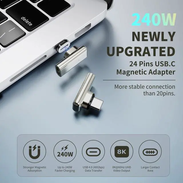 - The 240W 24-Pin USB C Magnetic Adapter plugs two adapters side-by-side into the USB-C port of your MacBook Pro or other device. Magnetic connection is automatic, fast and easy for simultaneous charging and data transfer.