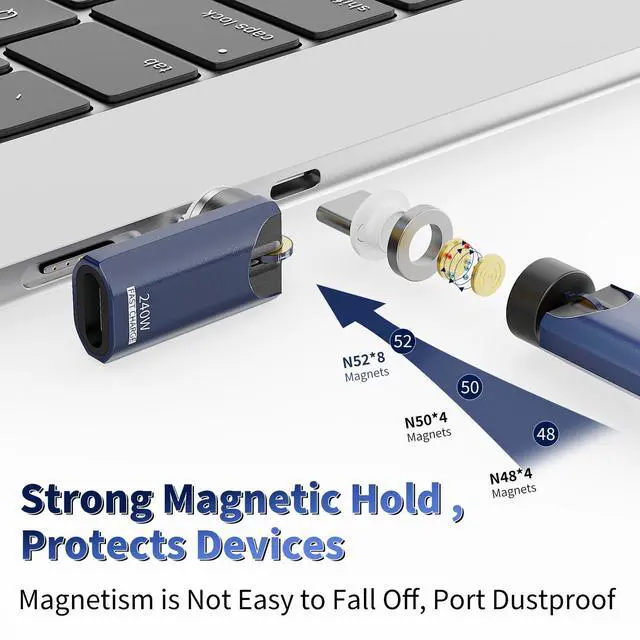 Strong magnetic attraction, precise adhesion: The Magnetic USB C Adapter is equipped with a built-in strong magnetic module, automatically aligning and adhering when brought close, achieving rapid and precise connection within 1 second, eliminating the hassle of repeated plugging and unplugging. The magnetic force is strong and stable, remaining securely attached even with minor movements, making single-handed operation more convenient and charging more efficient.