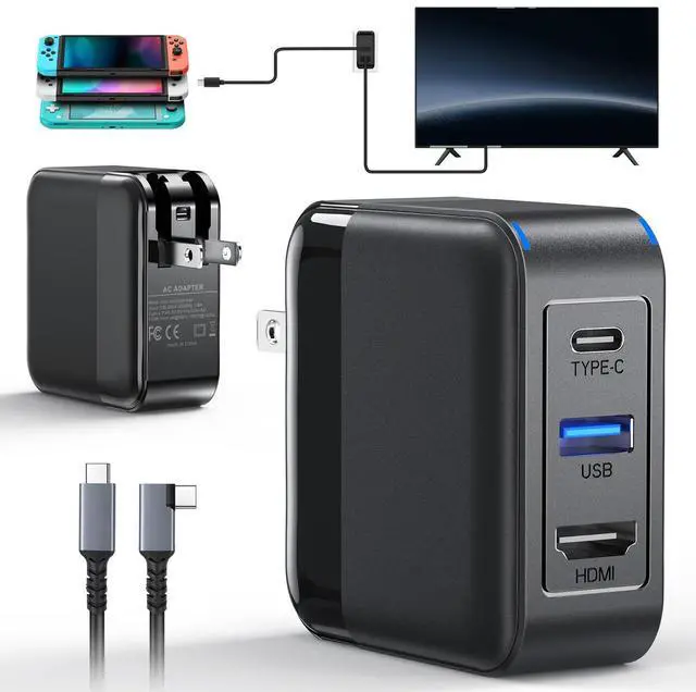3-in-1 Switch TV Charger Dock, Compact and PortableBuilt-in intelligent protection GaN chipset prevents overcurrent, overheating, and overvoltage. It combines the Switch dock and charger functions into one, achieving a portable design. The portable Switch TV dock makes the adapter an ideal choice for carrying or traveling, and perfectly replaces the official dock and separate charger