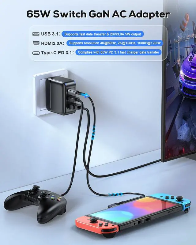 65W GaN Switch TV Charger Adapter for Nintendo Switch/OLED/Steam Deck/ROG Ally/Phone/Notebook-HDMI 2.0A 4K/60Hz - Fast Charging AC Adapter USB-C PD3.0 -Cable Included