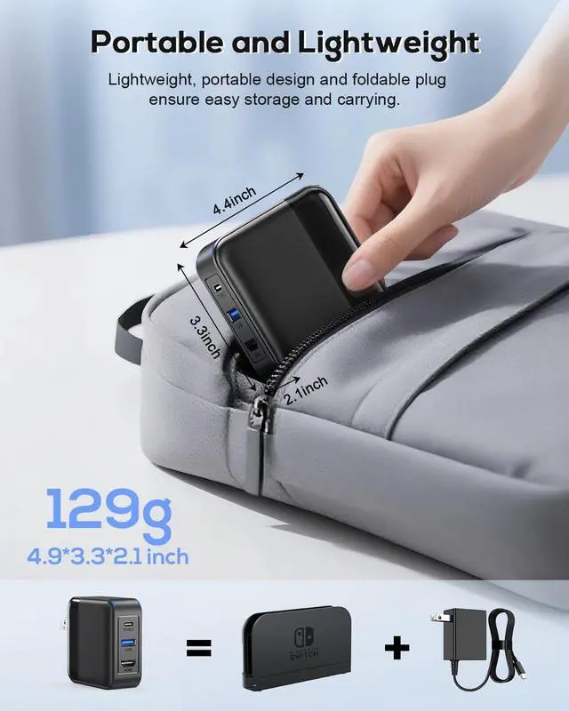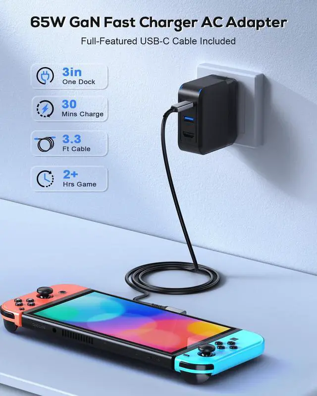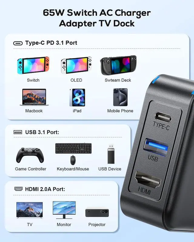 65W GaN Portable Switch TV Charger DockThe Portable Switch Charging Dock is specifically designed for Nintendo Switch/OLED/Steam Deck/ROG Ally/Phone/NoteBook. It serves as an ideal alternative to the official Switch dock, supporting 4K@60Hz TV output and 1080P/120Hz HDR/UHD output. This Switch dock is extremely compact and easy to carry. It combines the functions of the original dock and an AC charger, saving money and space