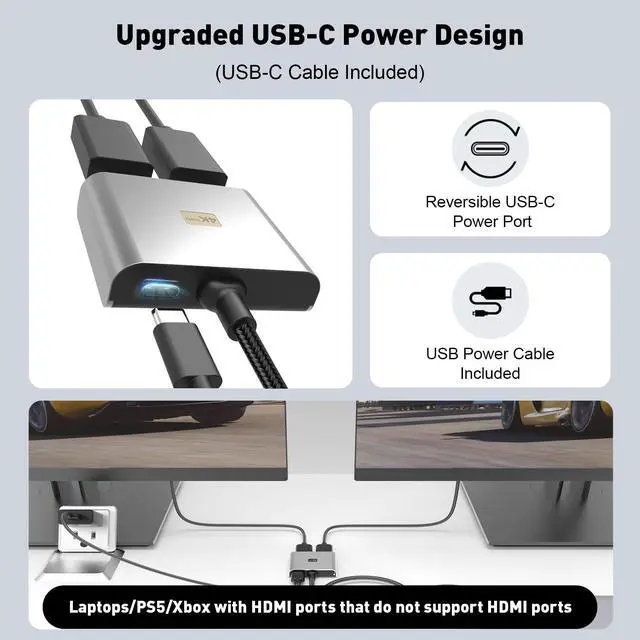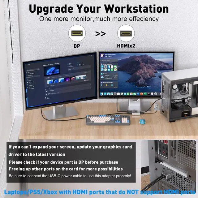 Plug and Play SolutionThe DP to Dual HDMI Adapter is plug-and-play, no drivers to install, no time to waste, and easily extends dual displays. Usage: Plug the DP male connector into the signal source (PC, laptop, graphics card); connect the included power cable to provide 5V/1A current; 2 HDMI female connectors are connected to the displays via a HDMI extension cable that supports 4K@60Hz. *Note: Integrated GPU computers can only support mirroring mode or can only extend one monitor