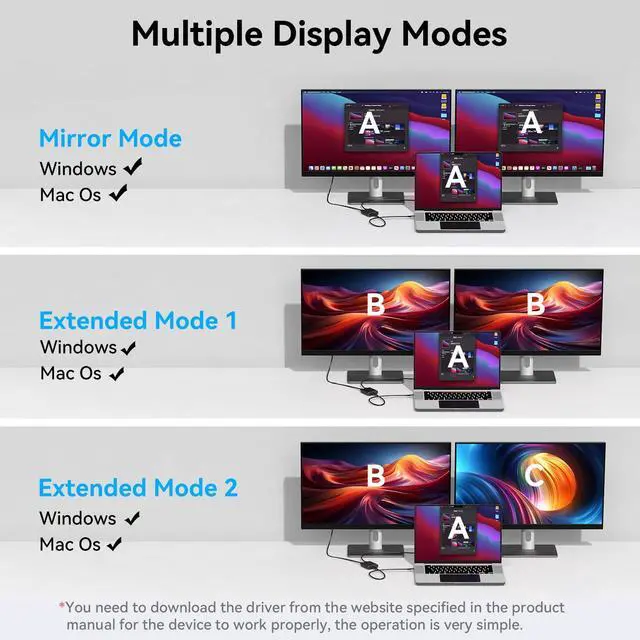 - Both Windows and Mac systems support dual-screen extension mode and dual-screen mirroring mode.
