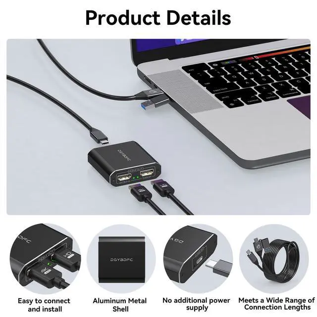 The dual HDMI adapter is small and can be easily carried. The aluminum shell ensures good heat dissipation and durability, allowing the adapter to maintain a stable working condition even in long-term operation.