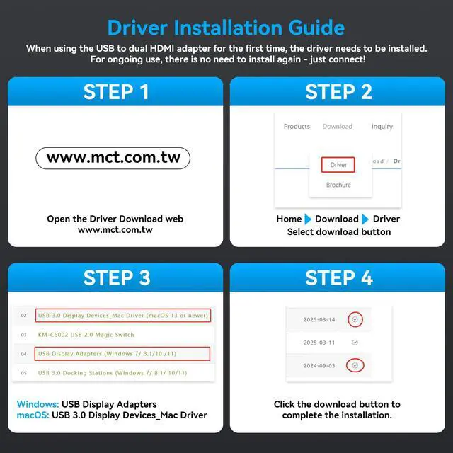 - The driver must be downloaded from the website specified in the product manual for the device to work properly, and the operation is very simple.