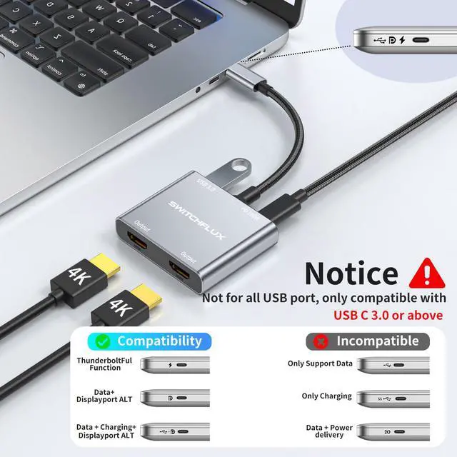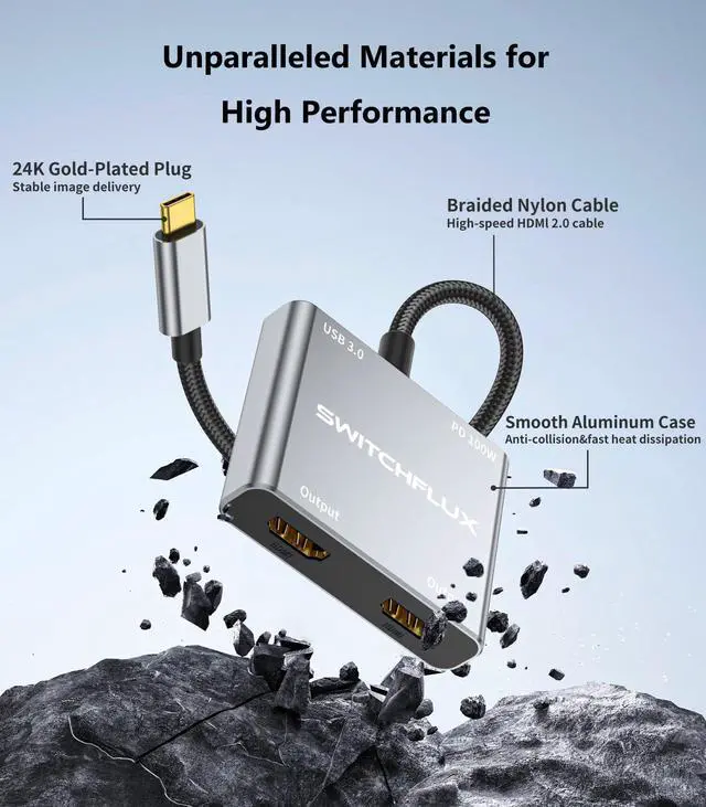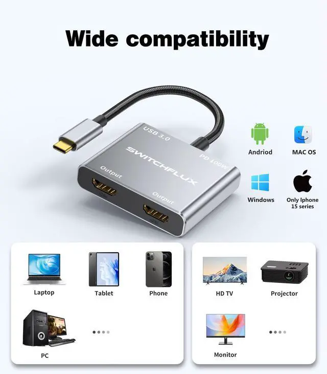 USB C to HDMI Adapter: SWITCHFLUX USB C to Dual HDMI Adapter has a resolution up to 4K@60Hz, dual displays support 3840x2160@60Hz at the same time, the hdmi splitter adapter also supports 2K@60Hz,1080P@60Hz provided by Windows MST technology, built-in 100W PD charging function allows you to quickly charge your devices while expanding your display. Connectors USB C 3.0 Gold-plated Male (Input) HDMI 2.0×2 Gold-plated Female (Output) USB 3.0 ×1 100PD Fast Changing×1 Specification Shape: Compact,lightweight,easy to carry Installation : Plug and Play,No driver or software installation required Gold-plated connectors : Optimize its performance,resist corrosion Ultra HD : Supports resolution up to 4K@60Hz Package Contents: 1×Type C to Dual HDMI Adapter -Gray Note: 1.This is NOT a bi-directional 2.Make sure that your devices support 4K@60Hz resolution, otherwise 4K@30Hz, 2K@144Hz, 1080P screen display may appear 3.Before use, please modulate the display to the HDMI port to receive the signal