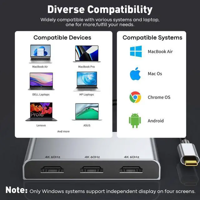 Triple Screen Expansion - Seamless CollaborationConnect source devices such as laptops with this USB C to three hdmi adapter, which supports triple independent display (MST technology) under Windows system, and a single device can be expanded to 3 HDMI displays with the highest resolution up to 4K@60Hz, HDR dynamic range enhancement, and fine colors without delay. Suitable for office, design, finance and other multi-tasking scenarios, enhance work efficiency