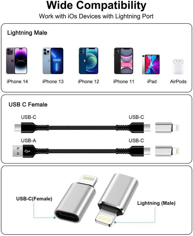 | Specifications | USB Type C, Lightning, 2, 0.009 kilograms, iPhone 14 Pro Max,iPhone 14 Pro,iPhone 14,iPhone 13 Pro Max,iPhone 13 Pro,iPhone 13,iPhone 12 Pro Max,iPhone 12 Pro,iPhone 12,iPhone 11 Pro Max,iPhone 11 Pro,iPhone 11,iPhone XS,iPhone XR,iPhone X,iPhone 8 Plus/8,iPhone 7 Plus/7, iPhone 6 Plus/6, iPhone SE 2020, Pad Pro 10.5', Pad Pro 12.9', Pod Nano 7, Pod Touch 5, Pad 5, Pad 4, Pad Air 2, Pad Air, Pad Mini 3, Pad Mini 2, Pad Mini |