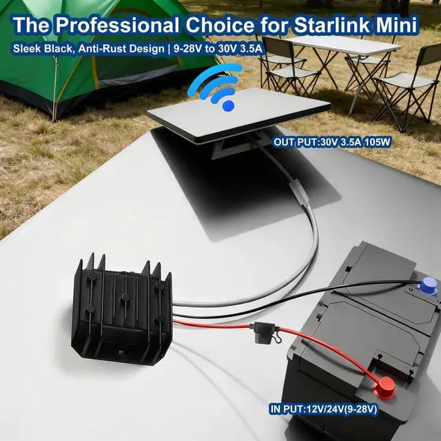 Perfect Starlink Mini DC Power Supply Solution This Starlink Mini 12V Adapter is specifically engineered to power your Starlink Mini dish anywhere. It seamlessly converts a wide input voltage 12V/24V(9V-28V) from your vehicle, solar panel, or battery into a stable 30V/3.5A output with DC female plug. Enjoy reliable, high-speed internet on the go in your Truck, RV, or during off-grid adventures, with no worry about voltage drops.