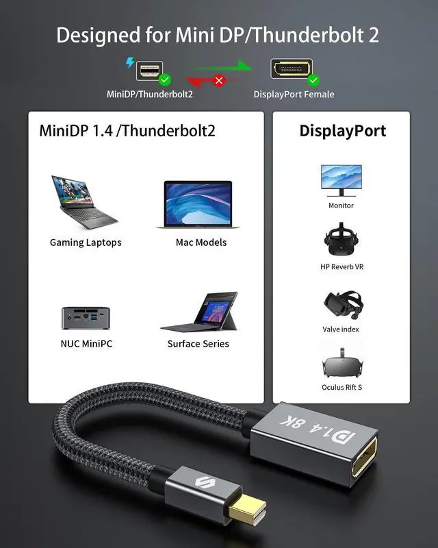 ![Alt view image 6 of 7 - 8K Mini DisplayPort to DisplayPort 1.4 Adapter, 8K@60Hz 4K@144Hz Mini DP to DP Adapter, HDR, DSC1.2, G-Sync FreeSync, for [Thunderbolt 2] Gaming Laptop, MacBook, iMac, Monitor, VR](https://c1.neweggimages.com/productimage/nb640/C5MSD2603180LETIAF7.jpg)
