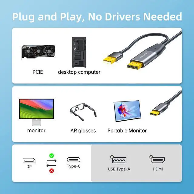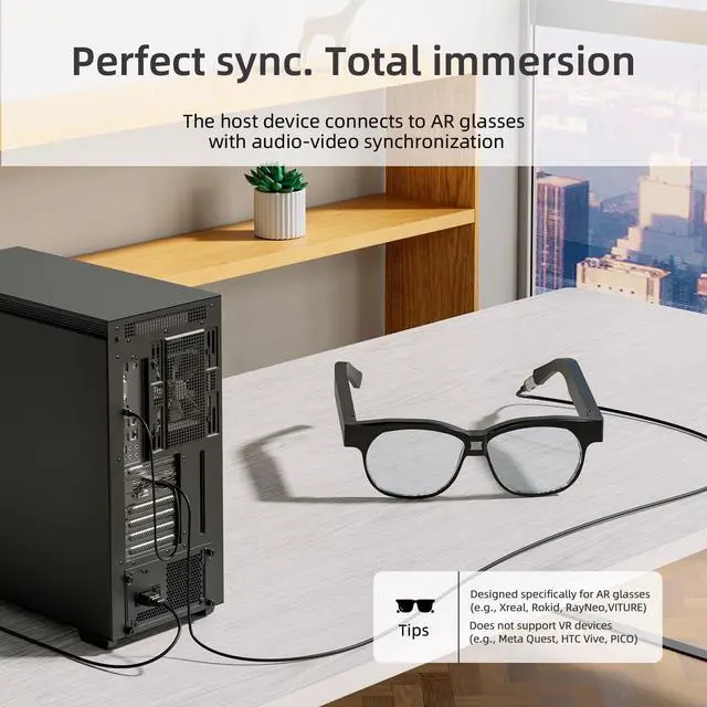 Note: Due to the limited power output of the USB-A port on this cable, it supports portable monitors up to 1080P resolution and under 15.6 inches in size. For portable monitors larger than 15.6 inches, an additional power cable connection is required. When using the USB cable connected to a computer’s USB port to power a portable monitor, please ensure the computer’s USB port provides sufficient current. Since AR glasses require less power, if adequate current is available, the USB cable can be connected to a power bank or external charger to supply power to the AR glasses