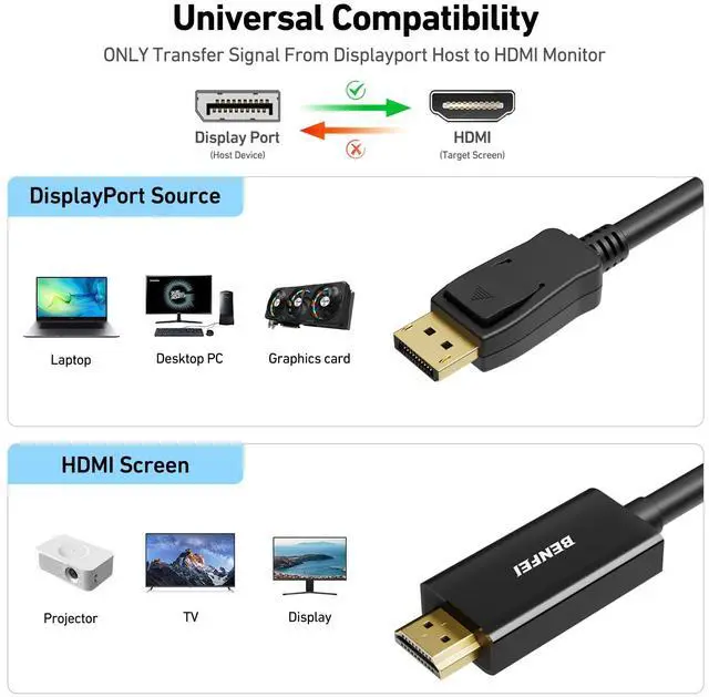 - The BENFEI DisplayPort to HDMI Cable - Black is designed for connecting DisplayPort equipped computer systems to HDMI equipped monitors, providing optimal video quality up to 3840*2160@30Hz, including 1080p HDTV or 1920 x 1200 PC graphics. It is a cost-effective solution to allow your DisplayPort computer to work with the HDMI display for business, home entertainment, conference rooms, and more.