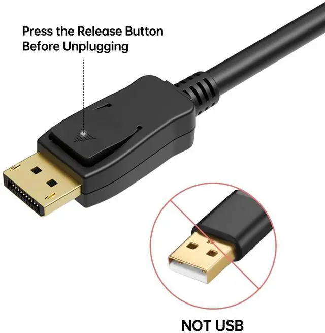 - DisplayPort connector with latches provides a secure connection, the latches will improve the connection stability in usage. When plug out, please press the realse button, and easy to pull out.