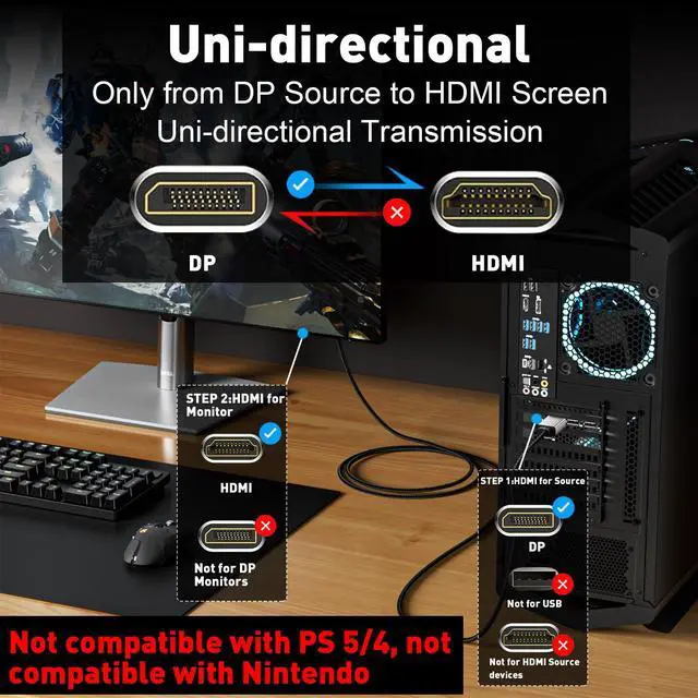 Unidirectional - only supported from DP source devices to HDMI display devices