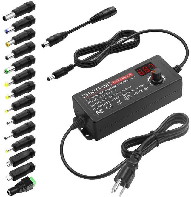 Input and Output: Input: AC 100~240V, 50/60Hz; Output: DC 3~24V Adjustable, Max 3A 72W; It can supply any voltage between 3~24V, such as 3V, 4V, 4.5V, 5V, 5.5V, 6V, 9V, 12V, 14V, 15V, 19V, 20V, 24V, etc., and any amp less than 3A, such as 300mA, 500mA, 1A, 1.5A, 2A, 2.5A, 3A. LCD display will show the output voltage, in case that wrong voltage regulation damages your device.