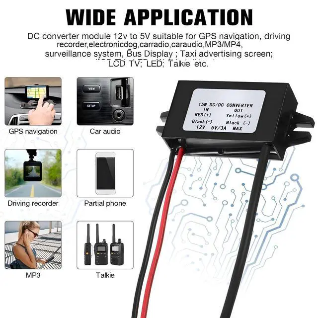 Wide Application: this DC converter module is widely applicable for various devices such as GPS navigation, driving recorders, electronic dog collars, car radios, MP3 and MP4 players, walkie talkies, surveillance systems, bus displays, taxi advertising screens, LCD TVs, and LEDs.