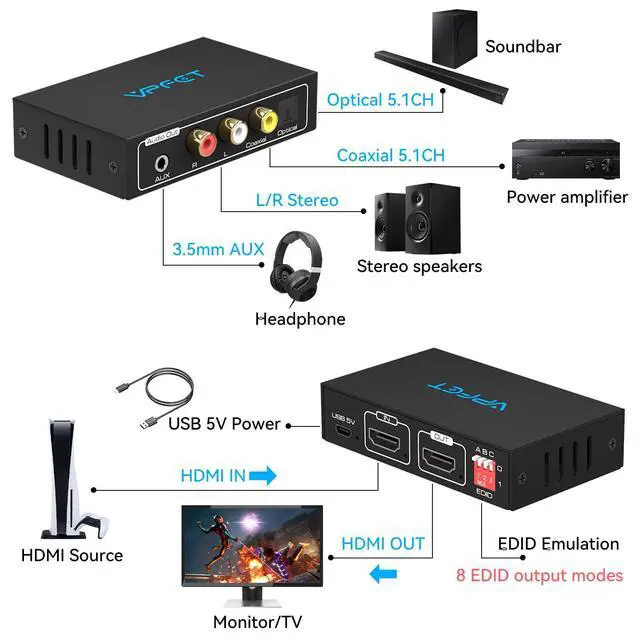 Wide Compatibility & Plug and PlaySuitable for various HDMI source devices such as Fire TV without a dedicated audio output, as well as Blu-ray/DVD/HD players, cable/satellite boxes, PS4, PS5, Xbox, PC/laptop, etc.