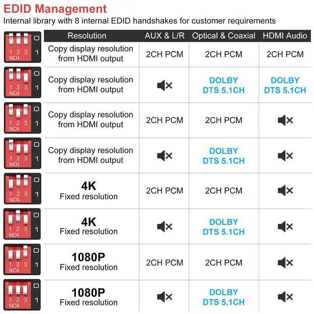 EDID system8 working modes allow you to easily set the desired configuration with the red switch. The device can automatically match the EDID data of the signal source and the display, or use the built-in fixed EDID data to ensure proper functionality. It also controls whether the HDMI output has sound or not (Note: ARC and eARC are not supported on this device)