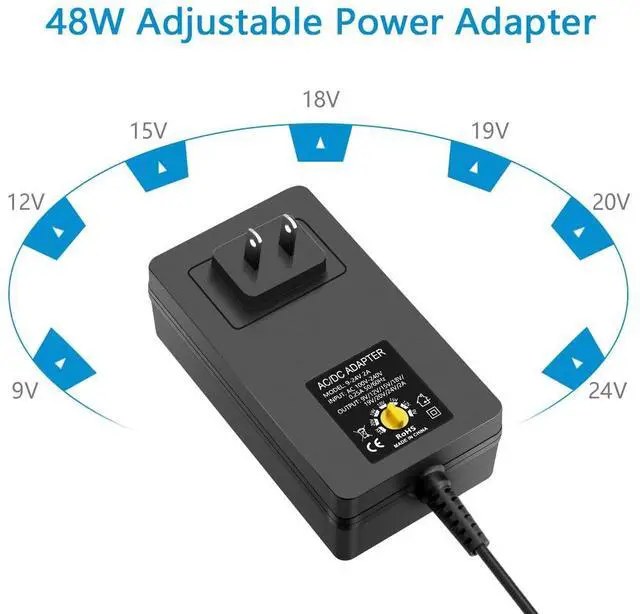 Input: AC 100~240V, 50/60Hz; Output: DC 9V 12V 15V 17V 19V 20V 24V adjustable, max 2A 48W. Can provide any current less than 2A, such as 500mA 800mA 1A 1.2A 1.5A 1.8A 2A, with 5.5mm x 2.5mm DC plug. The adjustable voltage can better match device parameters and supply more accurate and flexible changes.