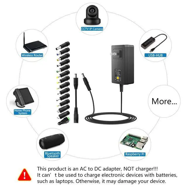 The 48W all-in-one multipurpose AC/DC adapter is suitable for many 9~24V electronics under 48W such as wireless routers, LED light strips, TV boxes, photo frames, Bluetooth players, wireless headphones, speakers, USB hubs, Wi-Fi cameras, Bluetooth charging boxes, printers, and security monitoring systems. This product is an AC to DC adapter, NOT a charger! It cannot be used to charge electronic devices with batteries like laptops, as it may damage your device.