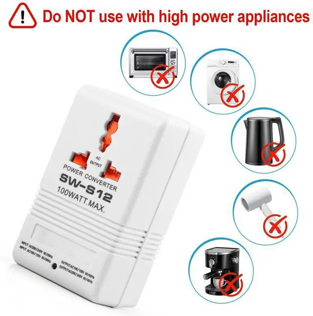 Typically, electrical appliances draw a high level of power at the moment of consumption, with a maximum output of 100W. For safety reasons, it is advisable to use electrical appliances that do not exceed 50W to prevent damage to the transformer and the appliances themselves.
