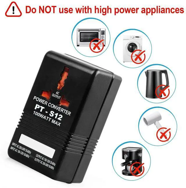 Typically, electrical appliances draw a high level of power at the moment of consumption, with a maximum output of 100W. For safety reasons, it is advisable to use electrical appliances that do not exceed 50W in order to prevent damage to the transformer and the appliances themselves.