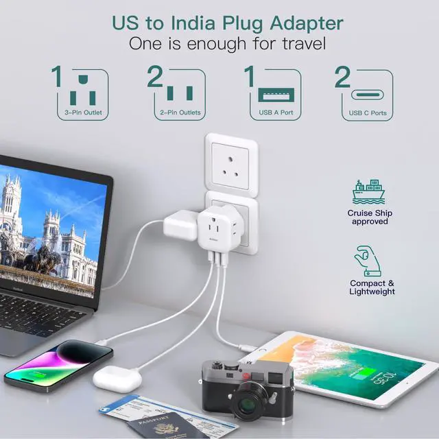 Travel Plug Adapter - This type D travel adapter is compatible in Bangladesh, India, Kuwait, Maldives, Namibia, Nepal, Pakistan, Qatar, Sri Lanka, and Yemen; Ideal for travelers, business professionals, and international students.