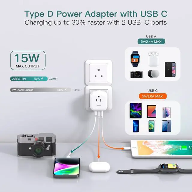 2 Pack Plug Adapter, Type D Travel Adapter with 3 Outlets 3 USB Charger (2 USB C Ports), Power Adapter Converter for USA to India, Bangladesh, Maldives, Pakistan, Nepal, Sudan