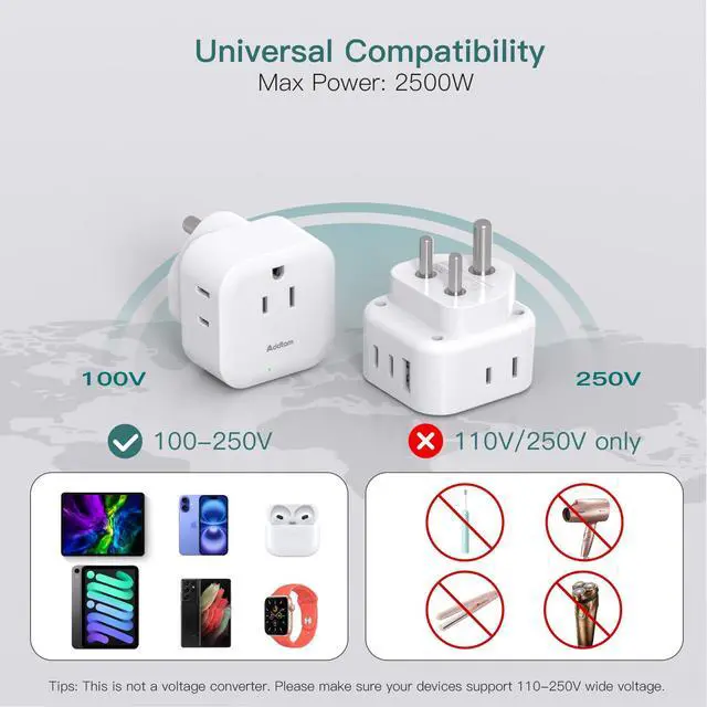 6-IN-1 Power Adapter - This adapter converts to 3 American AC outlets and 3 USB charging ports. Maximum capacity: 2500 watts (250 volts and 10 amps). With the 4-side design, 6 devices can be charged at once without interference. The larger space makes it easier to fit all electric equipment without blocking; there's no need to carry an extra adapter. Grab it and GO.