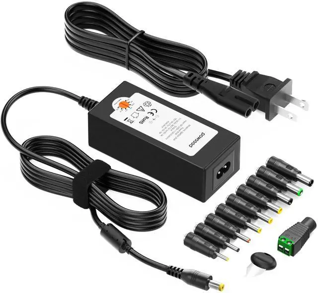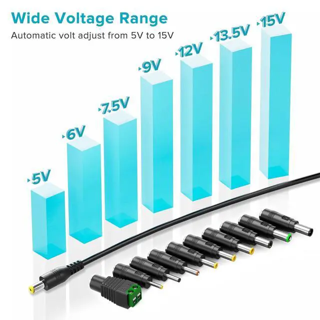 [Multiple voltage & various plugs] This 45 watt Universal AC Adapter Charger works for many household electronics, including routers, led strips, cctv cameras, webcams, USB hubs, android tablets, BT speakers, Echo devices, and more.