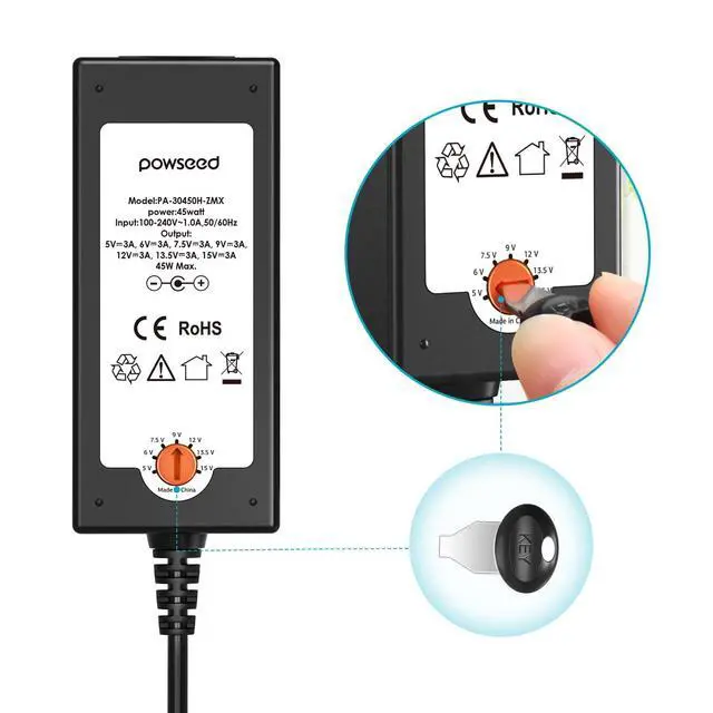 [Specification] Input: 110-240V; Output: 5V 6V 7.5V 9V 12V 13.5V 15V, 1A 2A 3A; Universal power supply provides 45W, 36W, 30W, 24W, and 12W. DC Plug Dimensions: 6.5x4.4mm, 6.3x3.0mm, 5.5x2.5mm, 5.5x2.1mm, 5.0x3.0mm, 4.8x1.7mm, 4.0x1.7mm, 3.5x1.35mm, 3.0x1.1mm, 2.5x0.7mm, LED Terminal for LED strips or other DIY. These popular tips meet your power needs for various small digital devices at home perfectly. With switching plugs and different voltage outputs, you can save money by not having to buy multiple voltage adapters.