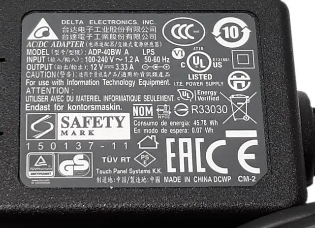 Delta Electronics AC Adapter ADP-40BW A Input: 100-240V 1.2A Output: 12V/3.33A ELO-Kit-02 Power Brick 3m-R E210973