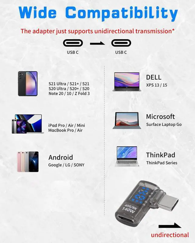 1, can change the direction of the USB C interface by 90 degree, effectively protect the USB C interface of the device, and support fast charging, data and video transmission.