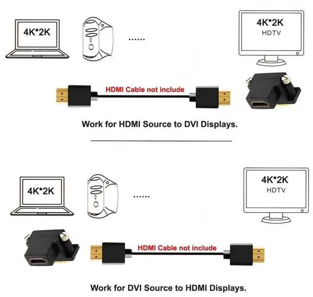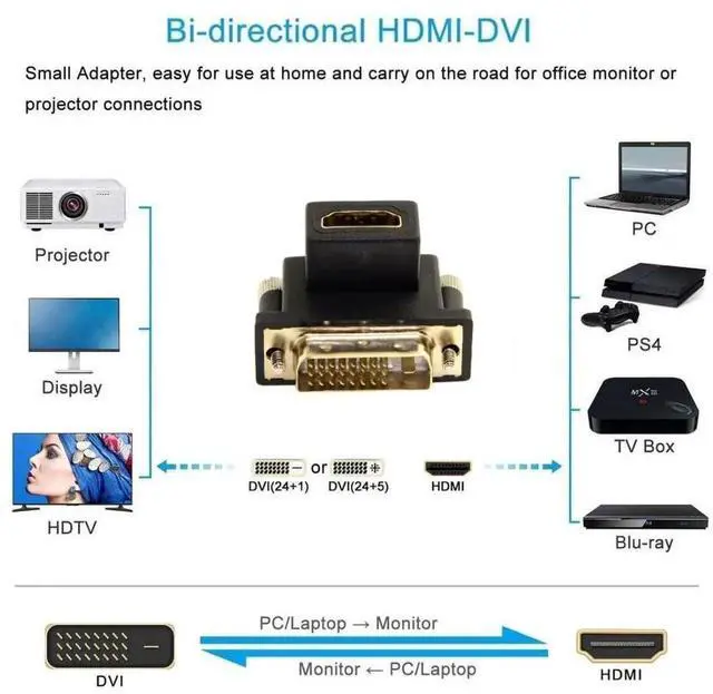 1) The HDMI-DVI bi-directional adapter can connect a computer with a DVI port to a monitor, HDTV, or projector with an HDMI port, or connect a computer with an HDMI port to a monitor with a DVI port.