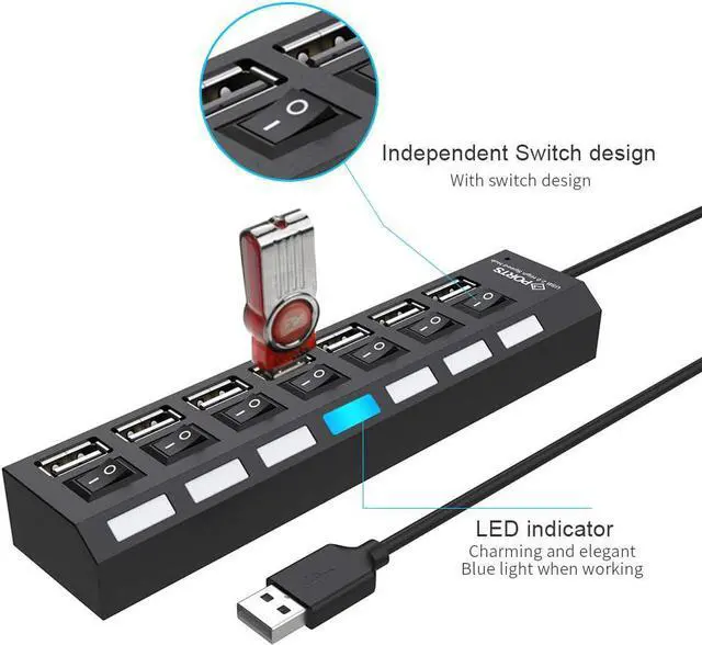 Multi-Port USB Hub: Instantly add USB 2.0 hub to any compatible device. 7-port USB splitter supports most commonly used USB devices, such as U disks, HDD, mouse, card readers, keyboards, mp3 players, etc.