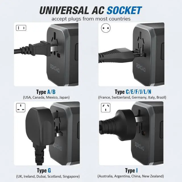 VERSATILE AC OUTLET - Accept not only our US plug, but also many other types of plugs from many EU countries, UK, AU and China. Please note that our adapter does NOT convert voltage (US/Canada voltage is 110-120V and most other countries are 220-230V), you must make sure that the AC-powered device you intend to use abroad supports dual voltage (most laptops and wall chargers do, and the input spec reads 100-240V, 50/60Hz on your device). For electric toothbrush, shaver/trimmer, water flosser, garment steamer, hair straightener, CPAP machine, it is extremely important to check the specs before your trip.